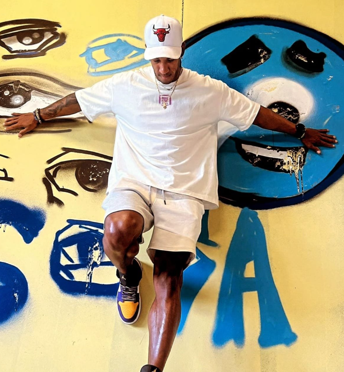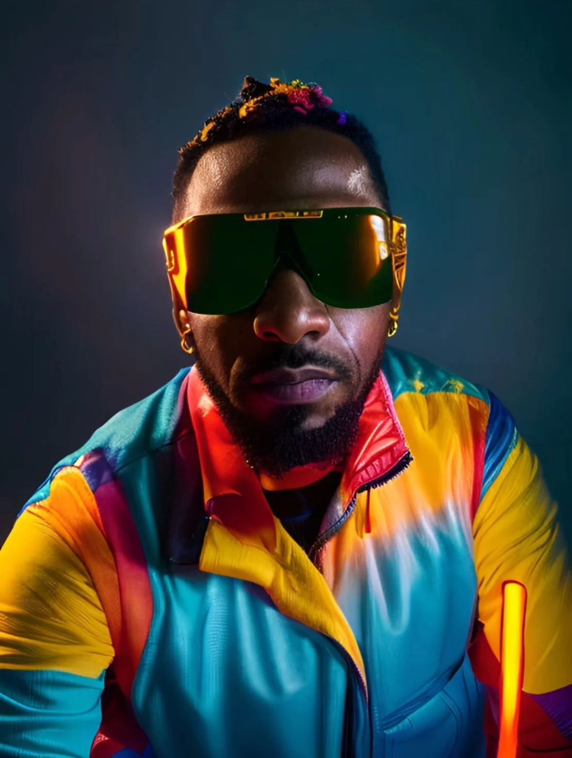 • Mann mit Dreadlocks, schwarzen T-Shirt mit Löchern, Kopfhörer um den Hals, gestikuliert mit den Händen, schwarzer Hintergrund.